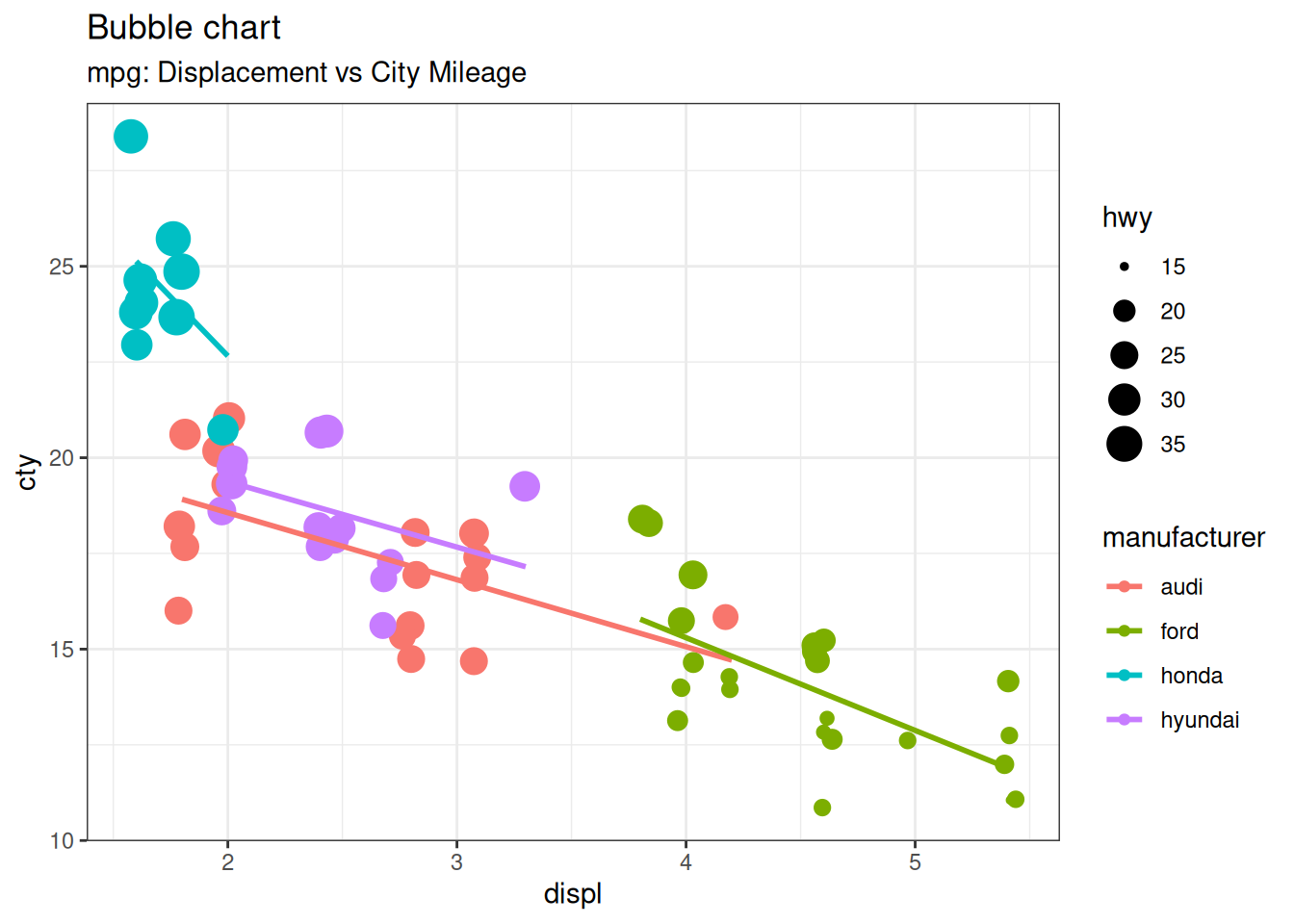 The bubble chart clearly distinguishes the range of displ between the manufacturers and how the slope of lines-of-best-fit varies, providing a better visual comparison between the groups.