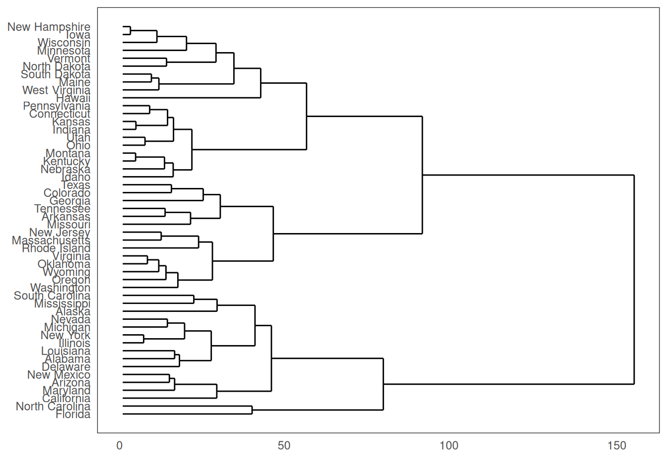 hc <- hclust(dist(USArrests), "ave") # hierarchical clustering