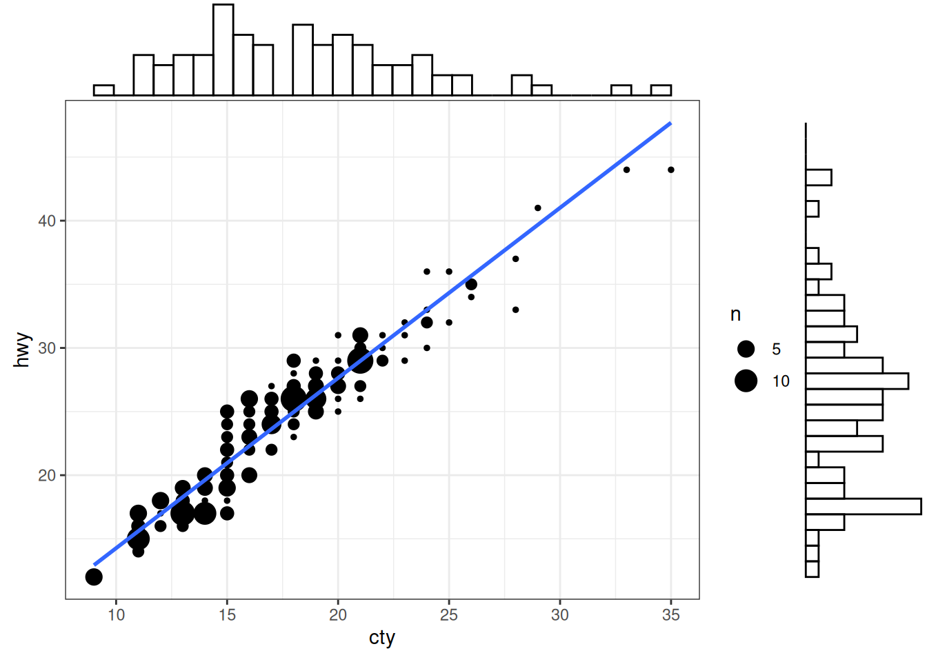g <- ggplot(mpg, aes(cty, hwy)) +